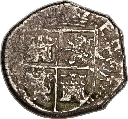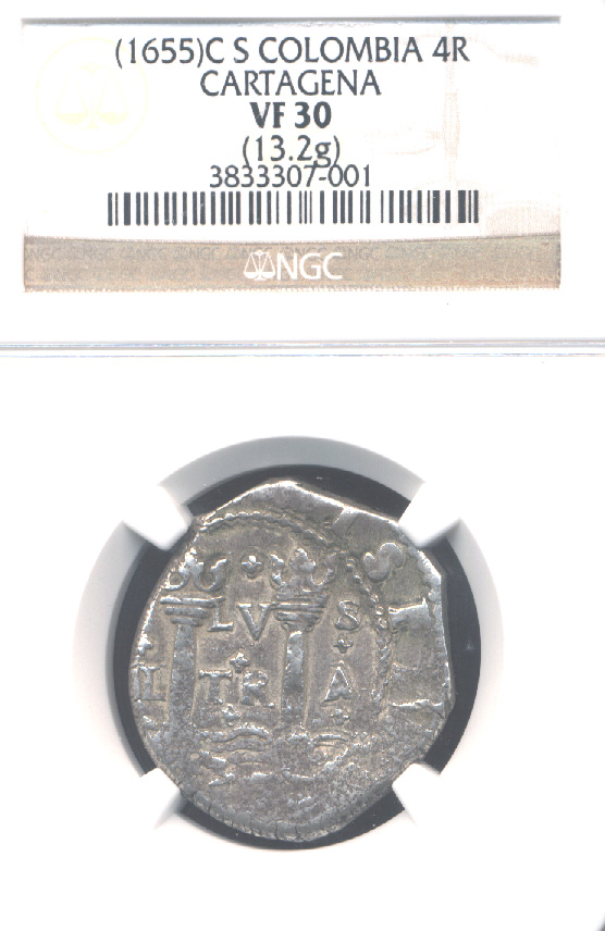 C88. Nuevo Reino de Granada (modern Colombia). Cartagena mint. (1655) CS. Four reales. An illegal issue struck after June 21st, 1655 for several months on the orders of Cartagena Governor Zapata. Very rare. Three collectible specimens are confirmed, plus a damaged coin de-accessioned from the Florida State Collection in 2001. The Florida State Collection retains three specimens, all from the Jupiter Shipwreck (1659) site. All the Florida State coins, plus the Marex-Ullian specimen, found in 1991 on the Maravillas (1656) site, show corrosion and heavy circulation wear. Two of the three collectible specimens are non-salvage coins: the present coin, which pedigrees to the Isaac Rodman Collection via Cayon, and a specimen pictured in Calico's Numismatica Espanola. This, the Isaac Rodman coin, is the only 1655 four reales seen by the grading services and competes favorably with the Calico coin (not seen in the marketplace in 50 years) for the title of finest known.