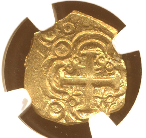 This rare date, unknown before the Fleet, is represented by only four dated collectible specimens, all found together in a small group 48 years ago this summer on the Nieves site. At the 1964 Division the State of Florida claimed half of the group, leaving Real 8 with four 1706's. Real 8 auctioned two of the coins (1967,1972) and kept (the best) two in their personal collections. This coin remained in the personal collection of an original Real 8 member for more than 40 years. Besides being the finest known 1706, this is one of the finest Bogota two escudos from the entire Fleet era. NGC and PCGS have graded no Fleet two escudos higher than MS 63.