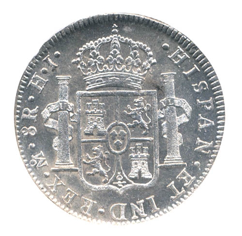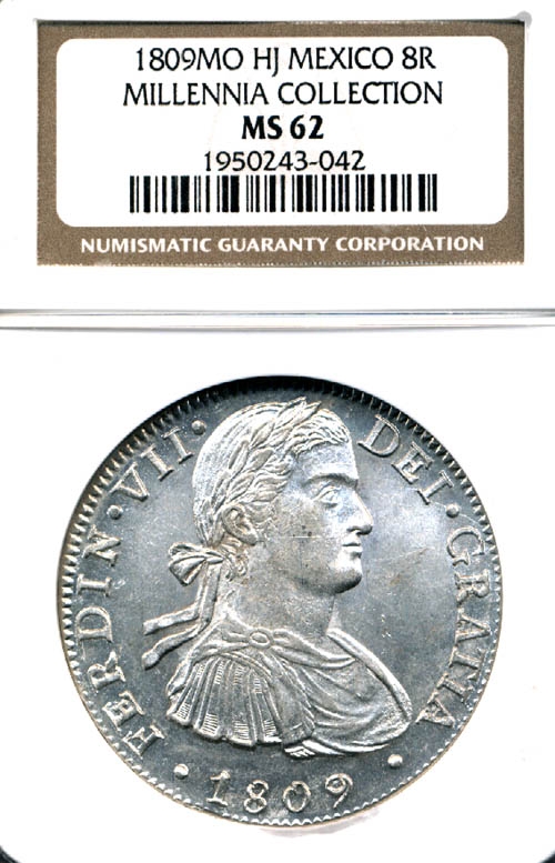 MR9. Mexico 1809 Mo HJ eight reales. Choice mint state with prooflike fields and frosty devices. Spectacular eye appeal. The money-is-no-object Millennia Collection could not find a better struck or more lustrous Mexican 8 reales of Ferdinand VII (probably because there isn't one). NGC "Millennia Collection MS 62" (undergraded) in its original holder from May 2008. Please see the excellent photo on page 209 0f the Millennia catalogue.