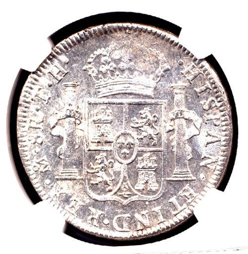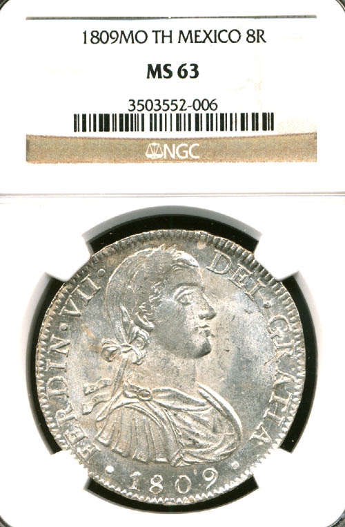 MR11. Mexico 1809 Mo TH eight reales. Early military bust of Ferdinand VII. Choice mint state with semi-prooflike fields and very frosty devices. The rare TH issue. For unknown reasons in early 1809 the veteran Tomas Butron Miranda (T) was replaced by Jose David Madrid (J). Henrique Buenaventura Azorin (HJ) remained the second assayer. Tomas remained at the mint until 1810 but was no longer in charge of 8 reales and escudos. Most of the 1809 issue, including the spectacular Millennia 1809 shown here, is struck under assayers HJ. Only one 1809, the commoner 1809 HJ, has been graded higher (MS 64) by the services.