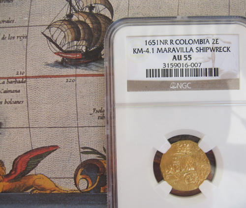 C1. From the 1656 Bahamian Shipwreck of the Spanish Galleon NUESTRA SENORA DE LAS MARAVILLAS, a Santa Fe de Bogota two escudos, a choice and very rare full-date 1651 issue. Just three 1651 Bogotas are known, two of them recovered from the Maravillas. [SOLD]