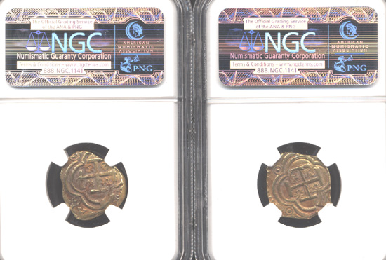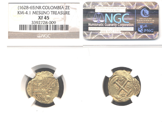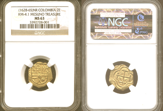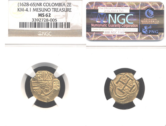 ME8. From the famous 1636 MESUNO Shipwreck Santa Fe de Bogota, two escudos (1636). A lustrous choice mint state coin NGC graded "Mesuno Treasure MS 63."