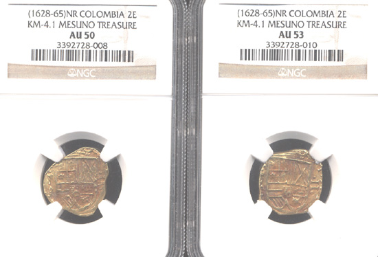 ME12. From Colombia's famous 1636 MESUNO Shipwreck, Santa Fe de Bogota, two escudos (1636). Two choice AU Mesunos with original reddish toning from the leather bags in which they were being transported. NGC graded "AU 53/50 Mesuno Treasure". SOLD.